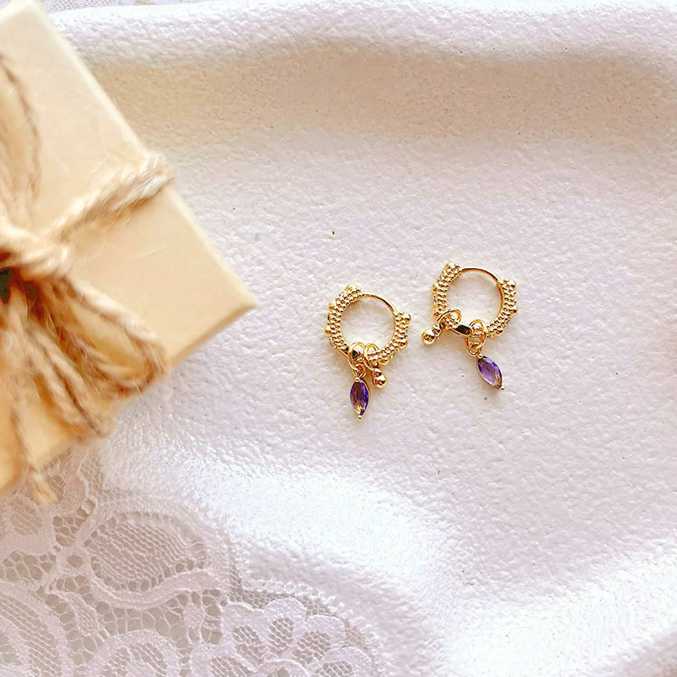 Embrace the nostalgic charm of cottagecore style with our Cottagecore Purple Droplet Huggie Hoops, exclusively available at Run Rabbit Run.