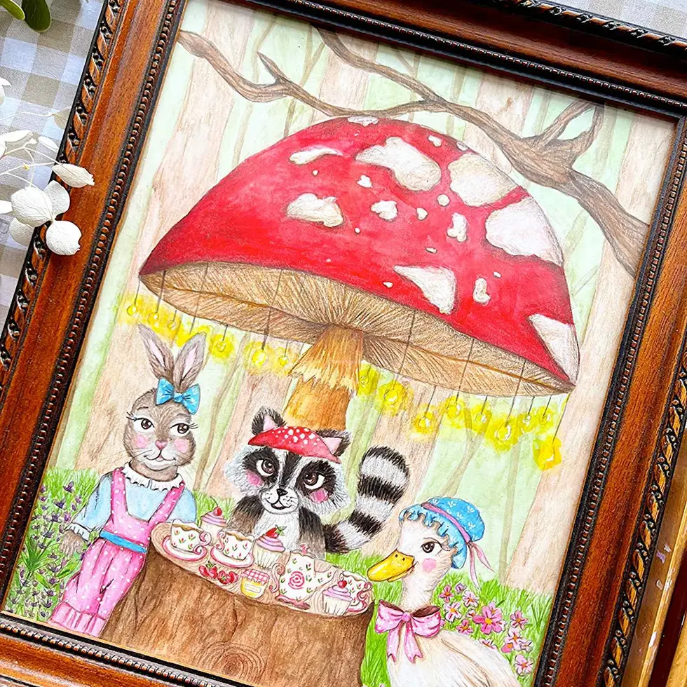 Depicting a quaint forest setting where a rabbit, raccoon, and duck gather for a whimsical tea party under a mushroom, using a tree stump as their table, this piece exudes playful elegance. The duck is wearing a frilly bonnet, and a charming pink polka dot bow, the raccoon has a mushroom hat, and the bunny is in a pinafore with a delicate bow in her “hair”. The tea party is set up with porcelain cups, saucers, and sweet treats, it’s a party no one would want to miss!