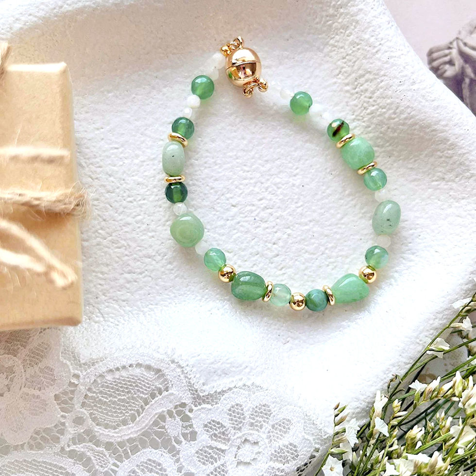 This unique handcrafted bracelet features Green Adventurine gemstones, known as "The Stone of Opportunity," attracting luck and optimism. Complemented by Green Agate for balance and growth, and Moonstone, evoking divine femininity and intuition, this piece is finished off with tarnish-resistant 14k gold-plated beads.
