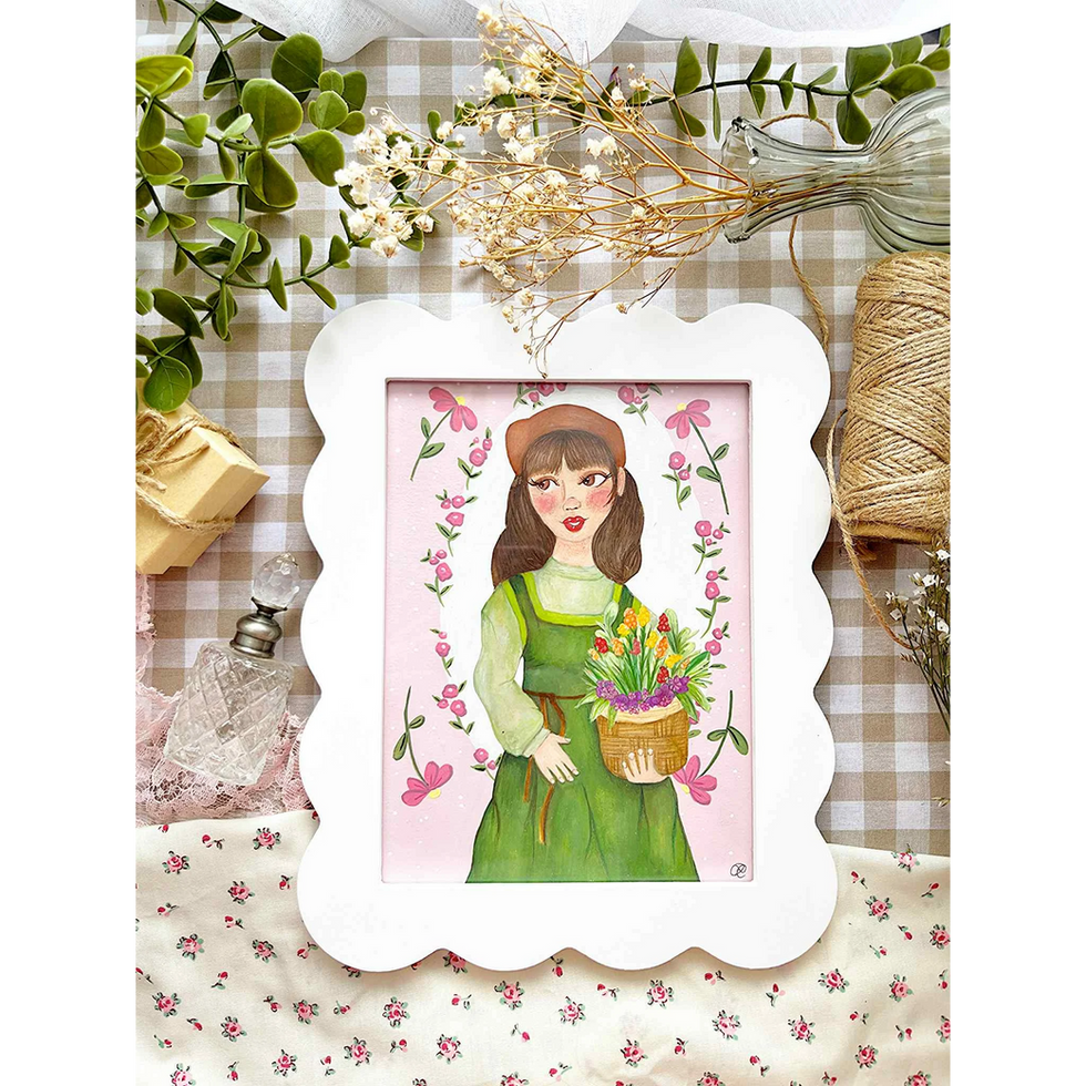 This portrait of a girl in a velvet green dress and brown beret, holding a basket of freshly cut flowers, is adorned with hints of pink and green floral embellishments.
